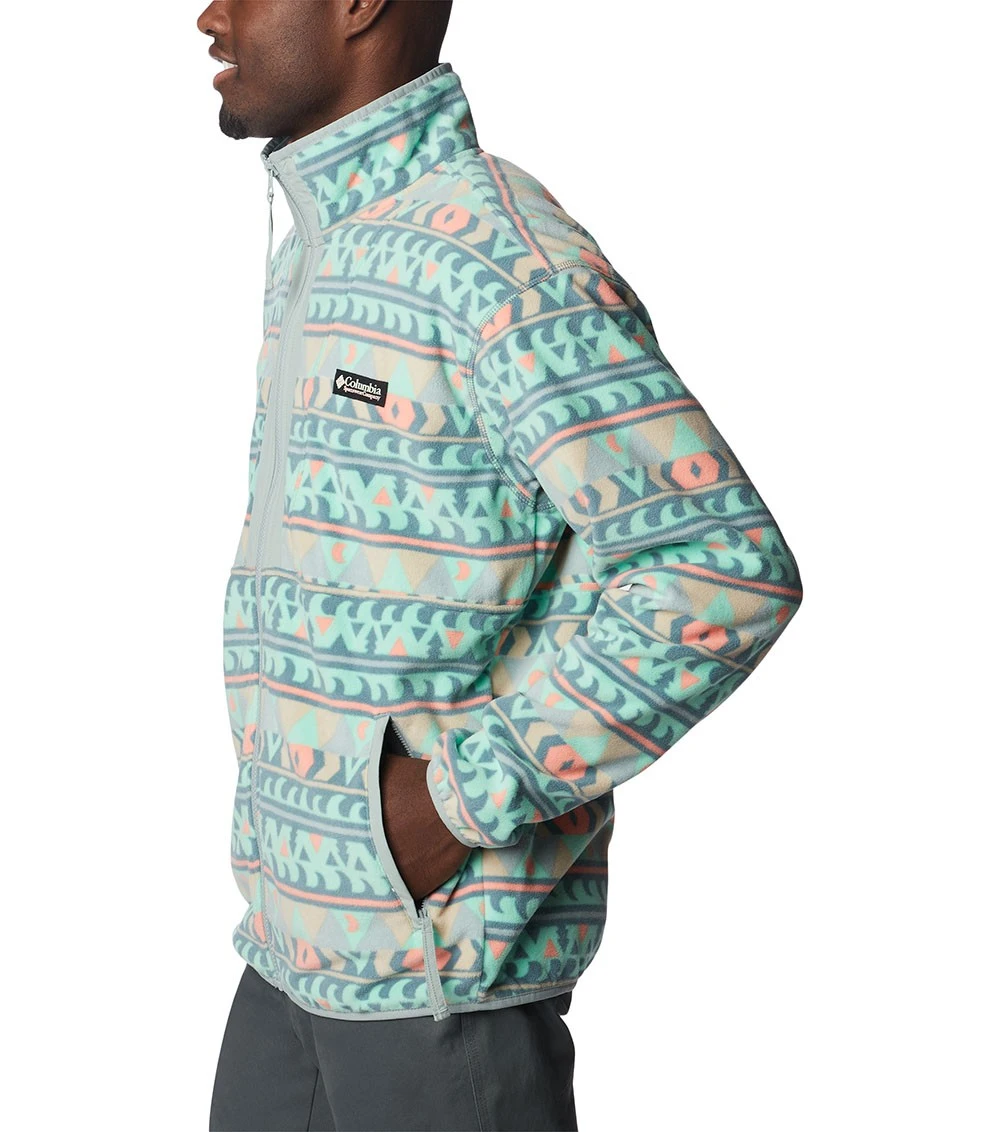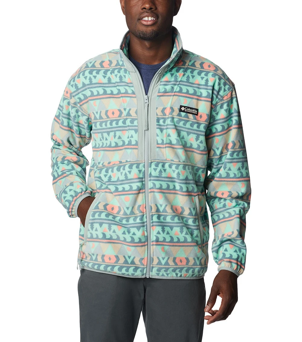 bold retro color combinations in this full-zip jacket. Velvety microfleece makes